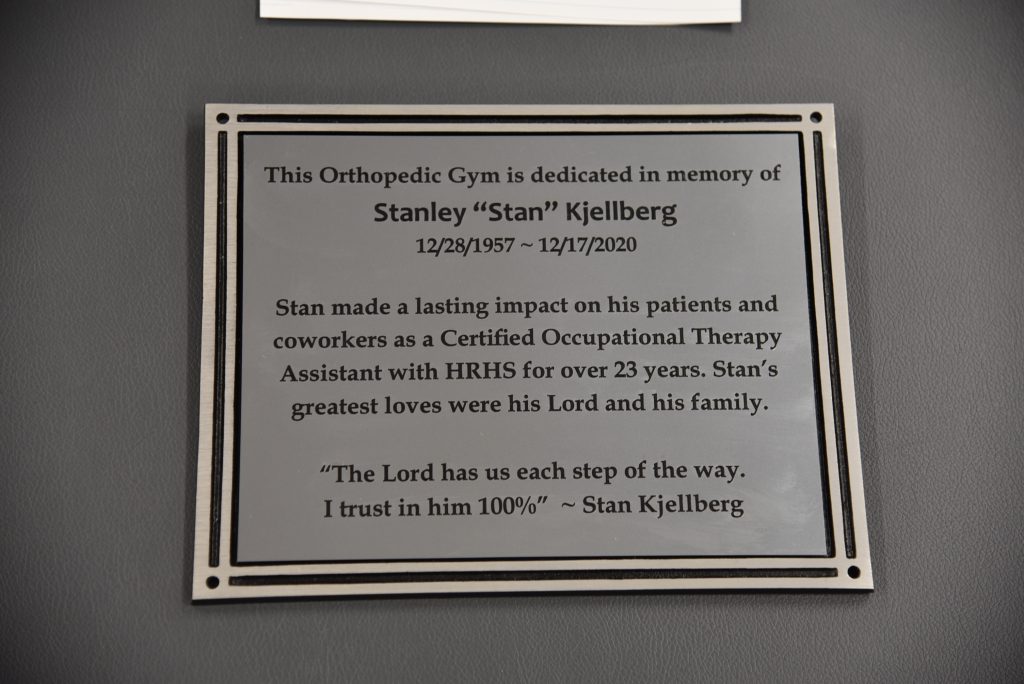 A permanent plaque now hangs at the entrance of the unit, which is on the third floor. The inscription tells the story of a beloved and revered employee. “Stan made a lasting impact on his patients and coworkers as a certified Occupational Therapy Assistant with Hutchinson Regional Healthcare System for over 23 years. Stan’s greatest loves were his Lord and his family.” Also inscribed is the last message he sent his wife before passing away: “The Lord has each of us each step of the way. I trust him 100%.” Stan’s wife Lisa and their two sons, Nicholas and Andrew, attended the dedication.