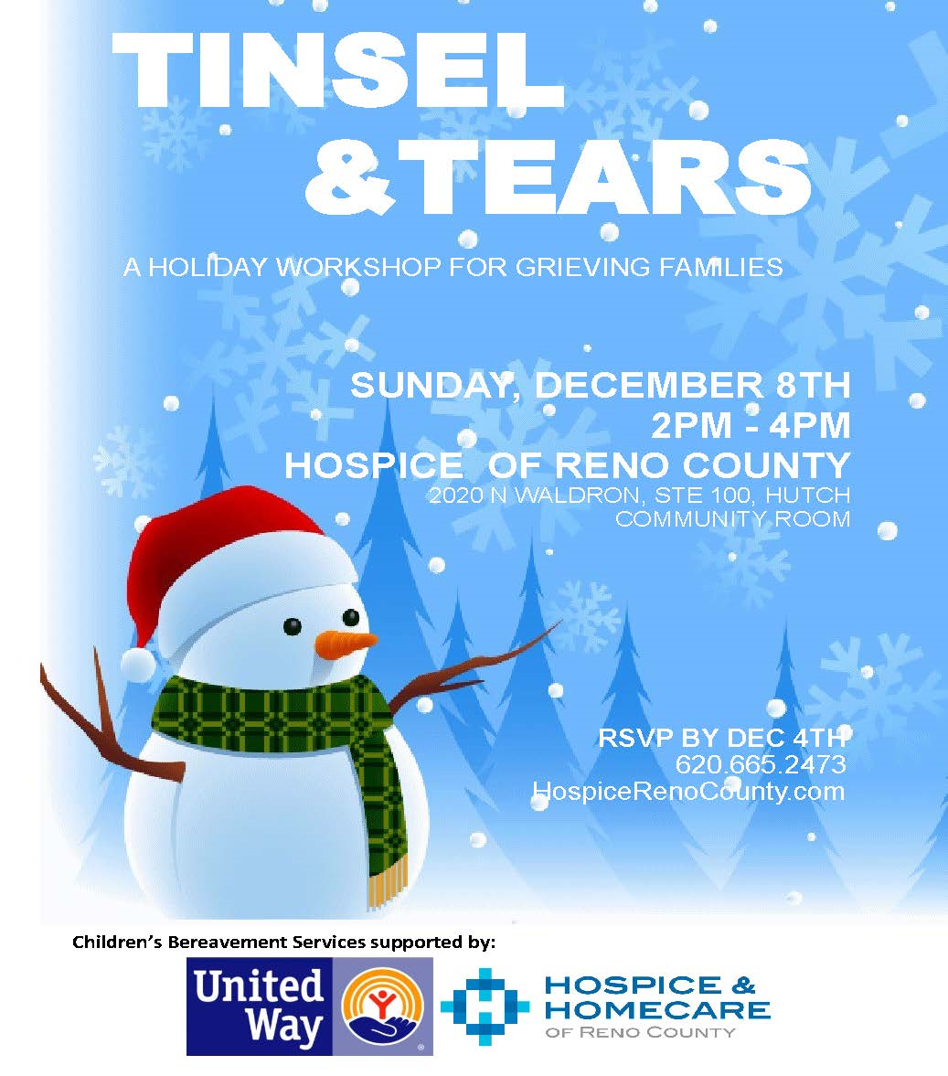 Tinsel and Tears, our annual Holiday Grief Workshop, will be held Sunday, December 8th, 2019 from 2pm – 4pm. This free workshop will be a time full of ways for children and their families to remember loved ones who have died while connecting with others who have experienced losses. Kids will participate in several fun activities while their parents/guardians spend time sharing and supporting one another in preparation for the holidays. There will also be a very special visitor!